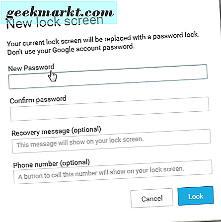 Als u de optie Vergrendelen kiest, wordt u gevraagd een nieuw wachtwoord voor het vergrendelscherm in te stellen om ongeoorloofde toegang te voorkomen. U zou ook een herstelbericht en telefoonnummer kunnen instellen dat zichtbaar zou zijn op uw vergrendelingsscherm. Als u dit doet, kan dit helpen uw apparaat te herstellen.