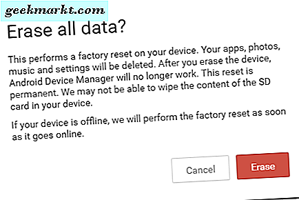 Als u de optie Wissen zou kiezen, zou uw apparaat volledig worden gewist. Let op: als u uw apparaat wist, functioneert Android-apparaatbeheer niet meer. Het is een permanente reset. De inhoud van uw SD-kaart kan mogelijk niet worden gewist bij het kiezen van deze optie. Als uw apparaat offline is, wordt het opnieuw instellen uitgevoerd zodra het weer online is. Dit is een laatste optie, zoals eerder vermeld, omdat u uw apparaat niet meer kunt volgen met Android-apparaatbeheer als deze optie wordt gebruikt.