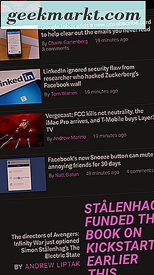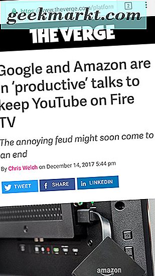 Hoe vaak Chrome uw tabbladen opnieuw laadt, is afhankelijk van het aantal geopende tabbladen op uw apparaat en hoeveel RAM uw telefoon heeft geleverd. Ons eerste testapparaat, een Galaxy S7-edge, bevat 4 GB RAM en had geen grote problemen met het openhouden van vijf of zes tabbladen op de achtergrond. Het apparaat kon redelijk consistent heen en weer schakelen tussen tabbladen zonder de pagina opnieuw te laden. Helaas was ons tweede testapparaat, een NVIDIA-schildentablet, bijna niet goed beladen. Het openen van meer dan twee tabbladen per keer veroorzaakte constante herlaadbeurten en het uitvoeren van Chrome op de achtergrond van het apparaat overbelaste de RAM, waardoor andere applicaties - waaronder media-apps zoals Google Play Music of Pocket Casts - werden gesloten. De Galaxy S7 edge heeft het dubbele RAM-geheugen van de Shield-tablet en bladeren in Chrome laat echt het voordeel zien van extra RAM. Apparaten als de OnePlus 5 / 5T en Samsung Galaxy Note 8 beginnen nu 6 GB of 8 GB geheugen te bevatten, dus verwacht dat browsen in de komende jaren van Android-updates verbetert.