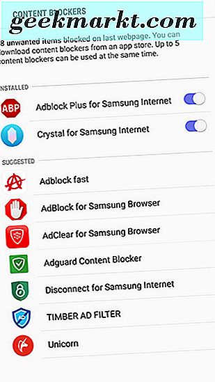 De spannendste extensie die in de internetbrowser van Samsung is toegevoegd, is inhoudsblokkering, een term die rechtstreeks afkomstig is van de mobiele versie van Safari van Apple en die gebruikers effectief toestaat advertenties te blokkeren tijdens het browsen. Maximaal vijf contentblockers kunnen tegelijk worden gebruikt, met opties zoals Adblock Fast, Adblock Plus, Crystal voor Samsung Internet, Unicorn en Disconnect voor Samsung Internet, waarvan de laatste ook de bovenstaande blokkeringsextensie aanstuurt. In onze tests leek Adblock Plus de beste in het verbergen van advertenties van onze browse-ervaring, drastisch afnemende laadtijden en in feite het elimineren van elke hoeveelheid stotteren. Op een apparaat met minder RAM-geheugen, zoals de Shield-tablet, heeft het ook het geheugengebruik helpen verbeteren. De meeste van deze inhoudsblokkers bevatten de mogelijkheid om een aantal voorgestelde advertenties toe te staan, en bevatten ook witte lijstopties om uw favoriete sites te laten betalen voor uw browsen.