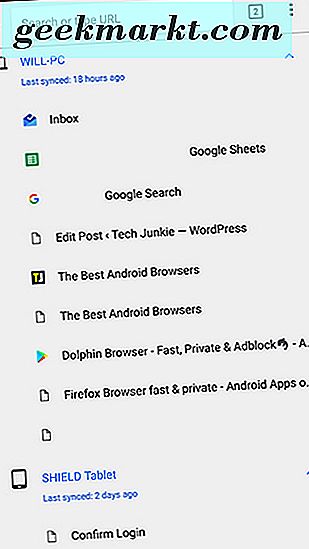 Wanneer u Chrome voor het eerst start op Android, wordt u gevraagd om u aan te melden met uw Gmail-account. Als u Chrome als uw desktopbrowser gebruikt, zult u hiervan houden. Al uw bladwijzers, browsegeschiedenis, zoekresultaten en meer synchronisatie tussen de instanties van Chrome. Voor iedereen die routinematig dezelfde sites bezoekt voor updates of nieuwe berichten (en we hopen dat TechJunkie een van die sites is), is dit een groot voordeel voor lezen en surfen op internet. Het versnelt niet alleen het surfen op uw mobiele apparaat, maar maakt het ook ongelooflijk gemakkelijk om op te halen waar u was gebleven wanneer u uw bureaublad achterliet. Aangezien Chrome alles kan synchroniseren van uw recente tabbladen (meer hieronder) tot uw meest bezochte pagina's tussen apparaten dankzij uw accountsynchronisatie, heeft u altijd snelkoppelingen bij de hand voor wanneer u een favoriete site wilt bezoeken.