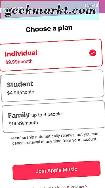 En net zoals ik zei voor Spotify, vind ik het een goed idee om je te abonneren op Apple Music voor slechts $ 9, 99 per maand. Met die $ 9, 99 heb je een bijna eindeloze catalogus met muziek om uit te kiezen, zonder dat je ze opnieuw hoeft te downloaden naar je telefoon zoals je moest doen voordat Apple een streamingdienst aanbood. Naast het $ 9, 99-niveau zijn er een paar andere opties die je kunt kiezen als het gaat om een abonnement op Apple Music. Naast het standaardabonnement is er een studentenoptie voor $ 4, 99 per maand en een gezinsoptie (maximaal 6 personen) die $ 14, 99 kost. Een van die opties is net zo goed een optie als het standaardabonnement, dus je kunt echt niet fout gaan.