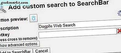 U kunt daar een sneltoets toewijzen door deze in te voeren in het tekstvak Sneltoets. Druk vervolgens op de knop Toevoegen aan SearchBar . Nu kunt u de nieuwe zoekmachine in de zoekbalk selecteren.
