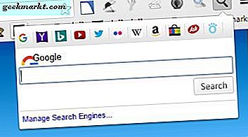 Klik op Zoekmachines beheren om er nieuwe zoekmachines aan toe te voegen. Voer vervolgens de titel en tekenreeks van de zoekmachine in het vak URL in. Voor de zoekreeks moet u een sleutelwoord in de URL vervangen door% s. De zoektekst van Dogpile is bijvoorbeeld http://www.dogpile.com/info.dogpl/search/web?fcoid=417&fcop=topnav&fpid=27&q=%s . Klik op Toevoegen op die pagina en open het zoekvak opnieuw. Vervolgens kunt u selecteren om pagina's te zoeken met de nieuw toegevoegde zoekmachine door op de knop boven het tekstvak van de extensie te klikken.