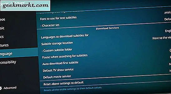 Begin door opnieuw op het instellingenpictogram van Instellingen te klikken of erop te tikken om uw voorkeuren te openen en selecteer Spelerinstellingen opnieuw. Selecteer opnieuw Taalinstellingen in het menu aan de linkerkant en schuif nog een keer omlaag naar de instelling Download Services. Je zult zien dat Kodi's instellingen zijn vernieuwd met een aantal nieuwe opties, en dit zijn wat we moeten veranderen. Eerder had jouw exemplaar van Kodi geen opties om standaard ondertitelopties in te stellen, omdat je geen optie voor je ondertitels op het platform had toegevoegd. Nu OpenSubtitles.org in Kodi is geïnstalleerd, kunt u uw instellingen voor het downloaden van de standaardondertiteling eigenlijk instellen en wijzigen.