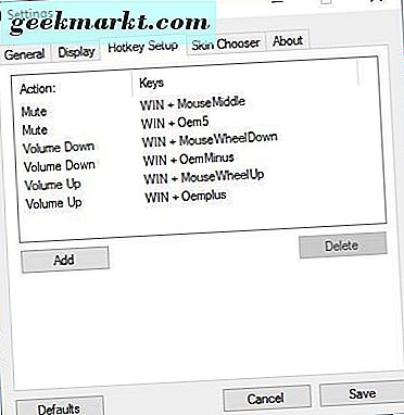 Dat venster bevat een sneltoets-instellingen tabblad. Dus klik op dat tabblad om een lijst te openen met alle standaard sneltoetsen van de software waarmee u het volume kunt aanpassen zoals hieronder. Merk op dat geen van deze sneltoetsen werkt wanneer het venster Instellingen geopend is.