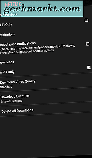 Over het algemeen moet je alles van geval tot geval bekijken bij het streamen op Netflix. Als de optie daar is, wordt het downloadpictogram weergegeven naast de optie om de film aan uw lijst toe te voegen en om de inhoud te beoordelen, of ziet u het pictogram naast elke afleveringstitel voor een televisiereeks. Je kunt je gedownloade serie vinden door op de menuknop in de linkerbovenhoek te tikken en op de optie "Mijn downloads" in deze lijst te tikken. De lijst met gedownloade media geeft de downloadgrootte weer en u kunt items selecteren om te verwijderen met behulp van het pictogram boven aan de pagina. Ten slotte kunt u uw downloadinstellingen aanpassen door helemaal naar de onderkant van deze lijst te scrollen en op de optie "App-instellingen" te tikken. Van daaruit kunt u uw downloadvideokwaliteit, de downloadlocatie (met de keuze tussen interne opslag of het gebruik van uw microSD-kaart) wijzigen en natuurlijk kunt u alle downloads van uw apparaat verwijderen.