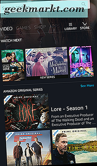 Ten eerste, net als bij alles in de Fire, moet je zeker weten dat je bent ingelogd op je Amazon-account. Dit zorgt ervoor dat je gemakkelijk films via Amazon kunt kopen zonder je accountgegevens voortdurend opnieuw in te voeren op je tablet. Nadat u bent ingelogd, keert u terug naar het startscherm en veegt u langs de hoofdinterface totdat u het tabblad Video op uw startscherm bereikt. Als u een hoofdabonnee bent, ziet u deze lijst waarschijnlijk gevuld met Prime-ready-inhoud, inclusief originele Amazon-shows en -films en een deel van hun exclusieve HBO-inhoud. Als u al aankopen in uw bibliotheek hebt gedaan, tikt u op het bibliotheekpictogram in de rechterbovenhoek van het scherm om uw volledige lijst met films en tv-programma's te openen. Tik anders op het pictogram Store om de juiste Amazon Instant Video Store te openen. U kunt hier zowel films die u streamt als niet-gestreamd zijn, en inhoud kiezen die u op uw apparaat kunt kopen.