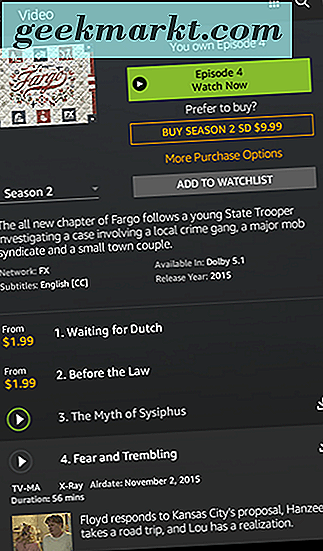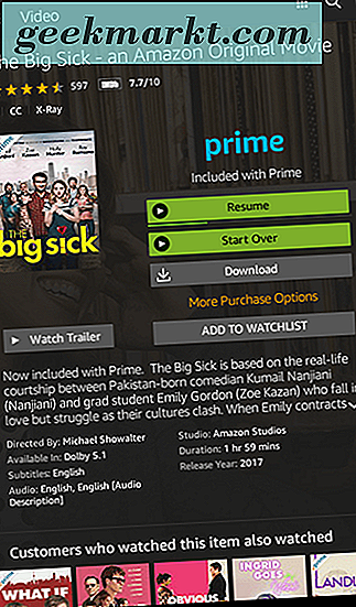 Ga zoals hierboven beschreven naar het videotabblad op het startscherm van uw apparaat en tik op het winkelpictogram. Hiermee wordt de volledige winkelinterface geladen, met zowel streaming-shows en films als verhuur en nieuwe releases. Als u de volledige verzameling Prime-inhoud wilt bekijken, typt u het tabblad 'Meegeleverd met prime' in het midden van uw display. U kunt de volledige lijst van zowel films als televisieprogramma's bekijken die beschikbaar zijn voor Prime-streaming. Er zijn tientallen categorieën vermeld in Amazon Prime, met alles wat beschikbaar is van aanbevolen films tot originele series die uitsluitend voor Prime-leden zijn gemaakt, maar bijna alles kan rechtstreeks naar uw apparaat worden gedownload. Zoek uw geselecteerde film en tik op het pictogram om de informatiepagina voor de film te bekijken. Vanaf hier ziet u dezelfde weergave als hierboven beschreven voor verhuur en gekochte films, maar in plaats van het verhuurde of gekochte bericht weer te geven, ziet u een Prime-logo samen met 'Included with Prime'. Hieronder ziet u de standaardknoppen voor 'Nu kijken', waarmee de inhoud naar uw apparaat wordt gestreamd en 'Download', waarmee de film offline op uw apparaat wordt opgeslagen. En net als bij uw gekochte tv-programma's kunt u afleveringen van geselecteerde prime-shows downloaden door op het downloadpictogram naast elke afleveringsnaam te tikken.
