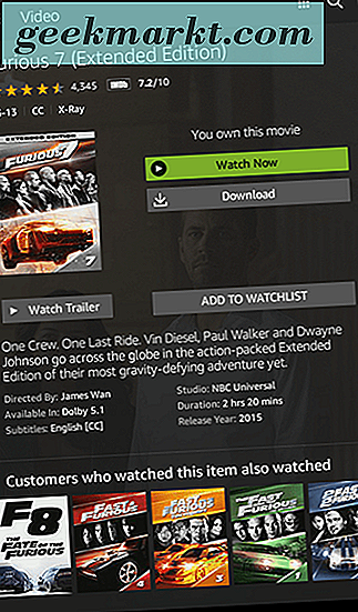 Binnen het tabblad Bibliotheek op uw apparaat ziet u een volledige lijst met uw gekochte en gehuurde films, samen met een lijst met uw tv-programma's op een afzonderlijk tabblad. Selecteer de film die u wilt downloaden en deze opent de informatiepagina voor uw film. Als u de eigenaar van de film bent, ziet u een scherm dat aangeeft dat u de film hebt gekocht, samen met de optie 'Nu kijken' en een optie 'Downloaden'. Als u op de optie "Nu kijken" tikt, wordt de film naar uw apparaat gestreamd; tikken op "Downloaden" downloadt de film naar je Fire-apparaat voor offline weergave. Als je de film hebt gehuurd, zie je dezelfde twee knoppen om je video te downloaden of te streamen, maar in plaats van een melding weer te geven dat je de film hebt gekocht, zie je een bericht met het aantal dagen dat je nog over hebt begin met het bekijken van de video. Elke huur van Amazon moet binnen 30 dagen worden bekeken; Zodra de film is gestart, heb je toegang om deze 48 uur te voltooien. Zelfs als de film naar uw tablet is gedownload, verloopt deze na de toegewezen hoeveelheid tijd.