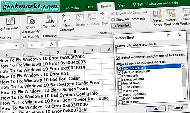 Niets sluit totdat u spreadsheetbeveiliging hebt toegepast. Als u het blad wilt beveiligen, klikt u op het tabblad Controleren. Druk op de knop Blad beveiligen op dat tabblad om een wachtwoordvenster te openen.