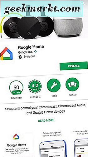 Eind 2016 heeft Google hun vorige ChromeCast-app geüpdatet, met de naam Google Cast, om de naam 'Google Home' te geven en ondersteuning toegevoegd voor de nieuwe Home Smart-luidspreker van Google. Als u de Google Cast-app eerder op uw apparaat had, ziet u dat de app is geüpdatet en nu 'Google Home' leest; als u het Cast-pakket met producten nog niet kent, kunt u het beste naar de app gaan Speel Winkel op en download het voor jezelf. Het is een gratis applicatie en beschikbaar voor elk Android-apparaat met Android 4.0.3 of hoger om te gebruiken.