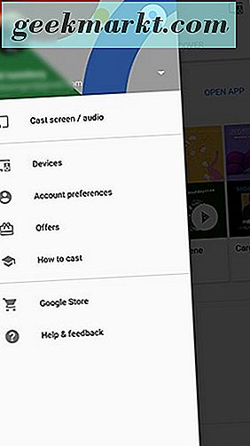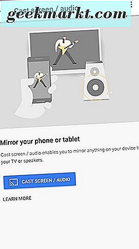 Okay, dus nu we de Google Home-app hebben gedownload en onze Chromecast-configuratie hebben ingesteld en klaar voor gebruik, kunnen we ons Android-apparaat spiegelen op een televisie of monitor. Ga naar de Google Home-app als je dat nog niet hebt gedaan, tik op de drievoudig-gevoerde menuknop in de rechterbovenhoek en tik op 'Cast Screen / Audio' bij de bovenste selectie van het menu.