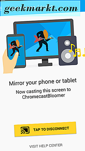 Wanneer de prompt 'Casten' wordt geopend, zoekt u de naam van uw persoonlijke Chromecast-apparaat en selecteert u de optie voor het spiegelen van het scherm van uw Android-telefoon of -tablet. Het is belangrijk om te onthouden dat uw apparaat extra batterijvermogen verbruikt en veel sneller leegloopt wanneer u uw scherm spiegelt in plaats van cast. Met Casting kun je de Chromecast gewoon vertellen wat hij uit de cloud moet halen; spiegelen gebruikt uw apparaat actief om informatie van het ene scherm naar het andere weer te geven. Als u zich zorgen maakt over de levensduur van uw batterij, sluit u uw telefoon of tablet aan op een stopcontact met behulp van de netadapter die bij uw apparaat is geleverd.