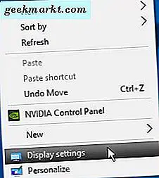 Hoe dan ook, u moet beslissen welke monitor als primair moet worden gebruikt. Dit is de eerste setup-optie waar u voor moet zorgen, en u doet dit door met de rechtermuisknop op uw bureaublad te klikken. De volgende stap is om "Weergave-instellingen" te kiezen, zoals weergegeven in de onderstaande afbeelding.