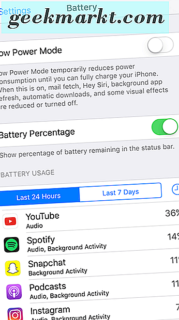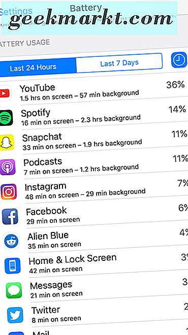 Naast de indicator is er nog een geweldige manier om op de hoogte te blijven van de prestaties van uw batterij op de iPhone. Als u iOs 9 of hoger hebt, hebt u een functie / instelling met de naam "Batterijgebruik". Deze functie is geweldig voor het bijhouden van het batterijgebruik en kan u laten zien hoeveel batterij uw verschillende apps gebruiken. U kunt het tijdsbestek tussen 1 dag en 1 week wijzigen, en beide opties laten u zien welke apps al uw batterijlevensduur beïnvloeden. Met deze functie kunt u ook zien hoeveel batterij de app gebruikt terwijl deze op het scherm staat en hoeveel deze op de achtergrond gebruikt. Veel mensen weten misschien niet dat deze functie bestaat, maar het kan een belangrijke hulp zijn bij het vaststellen waarom de batterij van uw telefoon in een alarmerend tempo aan het sterven is.