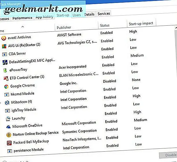 Naast deze opties is de beste manier om het opstarten van Windows 10 te versnellen gewoonlijk het verminderen van de opstartsoftware die wordt geladen met Windows 10. De Taakbeheer geeft u een overzicht van uw opstartsoftware in Windows 10. Klik met de rechtermuisknop op de taakbalk en selecteer Taakbeheer om het te openen en selecteer het tabblad Opstarten zoals hieronder.