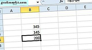 Selecteer cel B5 en klik in de fx-balk om een formule in te voeren. Voer de formule '= B3-B4' in en druk op de Return-toets. B5 retourneert nu de waarde 200, zoals hieronder wordt weergegeven.