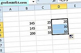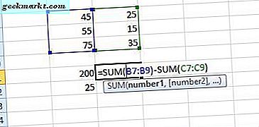 U kunt ook de totalen van het celbereik aftrekken zonder eerst de SUM-functies in het werkblad in te voeren. Voeg in plaats daarvan de celbereikverwijzingen toe aan een formule en trek deze af. Voer bijvoorbeeld de nummers '25, '' 15 'en' 35 'in cellen C7: C9 in. U kunt nu het totaal van het C7: C9-cellenbereik aftrekken van het eerder ingevoerde B7: B9-bereik.