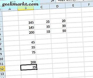 Voer bijvoorbeeld de waarden '45, '' 55 'en '75' in de cellen B7 tot B9 in. Voer vervolgens '200' in cel B11 in. Selecteer cel B12, klik in de fx-balk en voer '= B11-SUM (B7: B9)' in de formulebalk in. Cel B12 retourneert vervolgens de waarde van 25 zoals hieronder weergegeven. Dat trekt effectief het totaal van cellen B7: B9 af van 200 in cel B11.