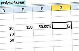 Nu kunt u een formule toevoegen die 50% aftrekt van 150. Klik op cel G3 en voer de formule '= E3- (F3 * E3)' in de functiebalk in. Cel G3 retourneert een waarde van 75, wat 50% van 150 is. De formule heeft dus 75 van 150 afgetrokken.