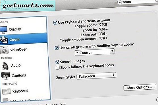Als u zeker wilt weten dat zoomen is ingeschakeld, selecteert u Zoom in het linkerdeelvenster van het menu Toegankelijkheid en vinkt u het vakje naast Sneltoetsen voor toetsenbord gebruiken om in te zoomen aan, scrolbeweging met modificatietoetsen gebruiken om in te zoomen en afbeeldingen vloeiend te maken. U kunt de zoomstijl vervolgens aanpassen aan uw behoeften.