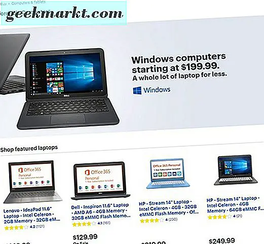 - Externe wederverkopers : Best Buy en Amazon zijn de twee voor de hand liggende keuzes hier, met zowel een breed scala aan laptops en desktops beschikbaar voor gebruikers om te kopen op meerdere prijspunten. Best Buy heeft fatsoenlijke laptops vanaf slechts $ 199, 99, met een volledige "Betaalbare computer" sectie die je gemakkelijk kunt doorbladeren. Vanaf het schrijven zijn sommige van deze laptops zelfs gedaald tot een dieptepunt van $ 129, 99 in de uitverkoop. Op dezelfde manier heeft Amazon een assortiment van computers beschikbaar voor ongeveer $ 199, en vaak heeft het verkoop waardoor gebruikers fatsoenlijke laptops kunnen aanschaffen tegen budgetprijzen. Beide plaatsen zijn een goede optie om goedkoop een laptop op te halen, en aangezien Best Buy ook een fysieke winkel is, is het ook een geweldige manier om snel een laptop te pakken als je dat nodig hebt. WalMart heeft ook een aantal laptops beschikbaar om te kopen, zowel online als in hun winkels, hoewel deze apparaten de neiging hebben om alleen naar het low-end toe te schuiven. Newegg en B & H zijn twee extra retailers die gespecialiseerde hardware kunnen aanbieden, meestal gericht op experts, gamers of makers van inhoud.