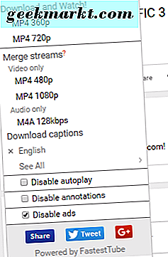 Wanneer u een nieuwe YouTube-video opent, ziet u een knop Downloaden aan de video, waarop u kunt klikken om een menu te openen waarmee u video's in zowel audio- als videoformaten kunt downloaden. Als u de hele video wilt opslaan met zowel audio als video, kunt u de video in MP4-formaat opslaan in 360p of 720p. Als u de video in een hogere kwaliteit wilt opslaan, bijvoorbeeld voor gebruik bij een eigen video-creatie, downloadt u een kopie van alleen 1080p-video's en een M4A-audiostream van betere kwaliteit voordat u de twee delen synchroniseert weer samen in de bewerkingssoftware van uw keuze.