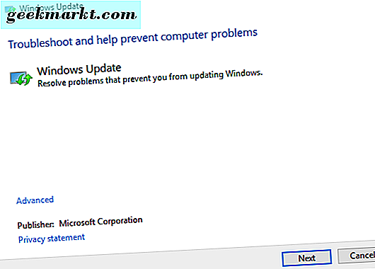 U kunt vanaf daar Fix problemen met Windows Update selecteren. Dat opent het hieronder getoonde Windows Update-venster. Klik daar op Geavanceerd en selecteer Reparaties automatisch toepassen als dit nog niet is geselecteerd. U kunt ook een optie Uitvoeren als beheerder selecteren. Klik op Volgende om de scan uit te voeren en Windows Update te repareren.