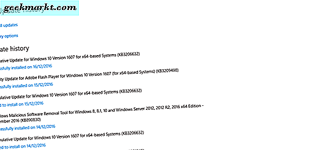 Windows heeft een systeemherstelprogramma waarmee gebruikers het kunnen herstellen naar een eerdere datum. Dit kan een aantal dingen repareren, waaronder vastgelopen updates. Dus probeer Windows te herstellen naar een datum waarop er geen updates vastzaten. U kunt uw updategeschiedenis bekijken door 'updates' in het zoekvak van Cortana in te voeren, Zoeken naar updates te selecteren en vervolgens te klikken op Geschiedenis bijwerken om het onderstaande venster te openen.